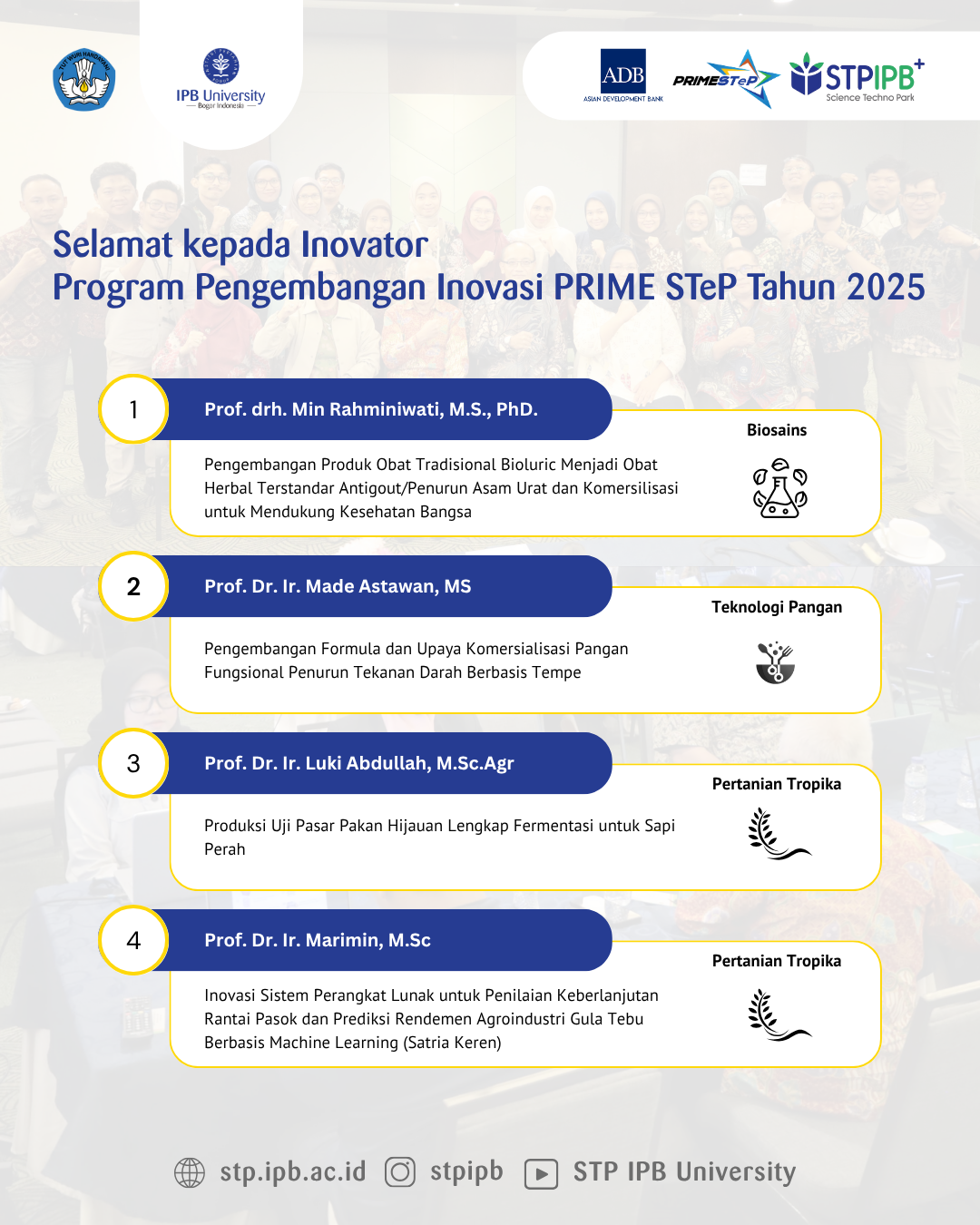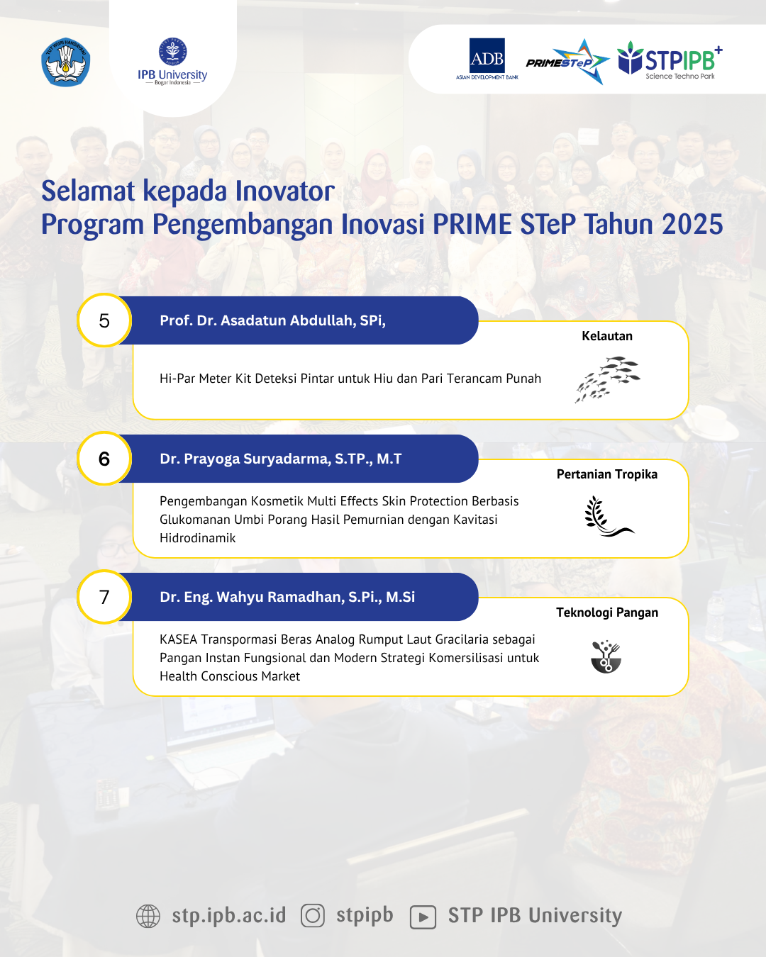 Science Techno Park (STP) IPB University melalui Lembaga Kawasan Sains dan Teknologi (LKST) resmi mengumumkan tujuh proposal penelitian yang berhasil lolos sebagai penerima Grant Inovasi PRIME STeP 2025.